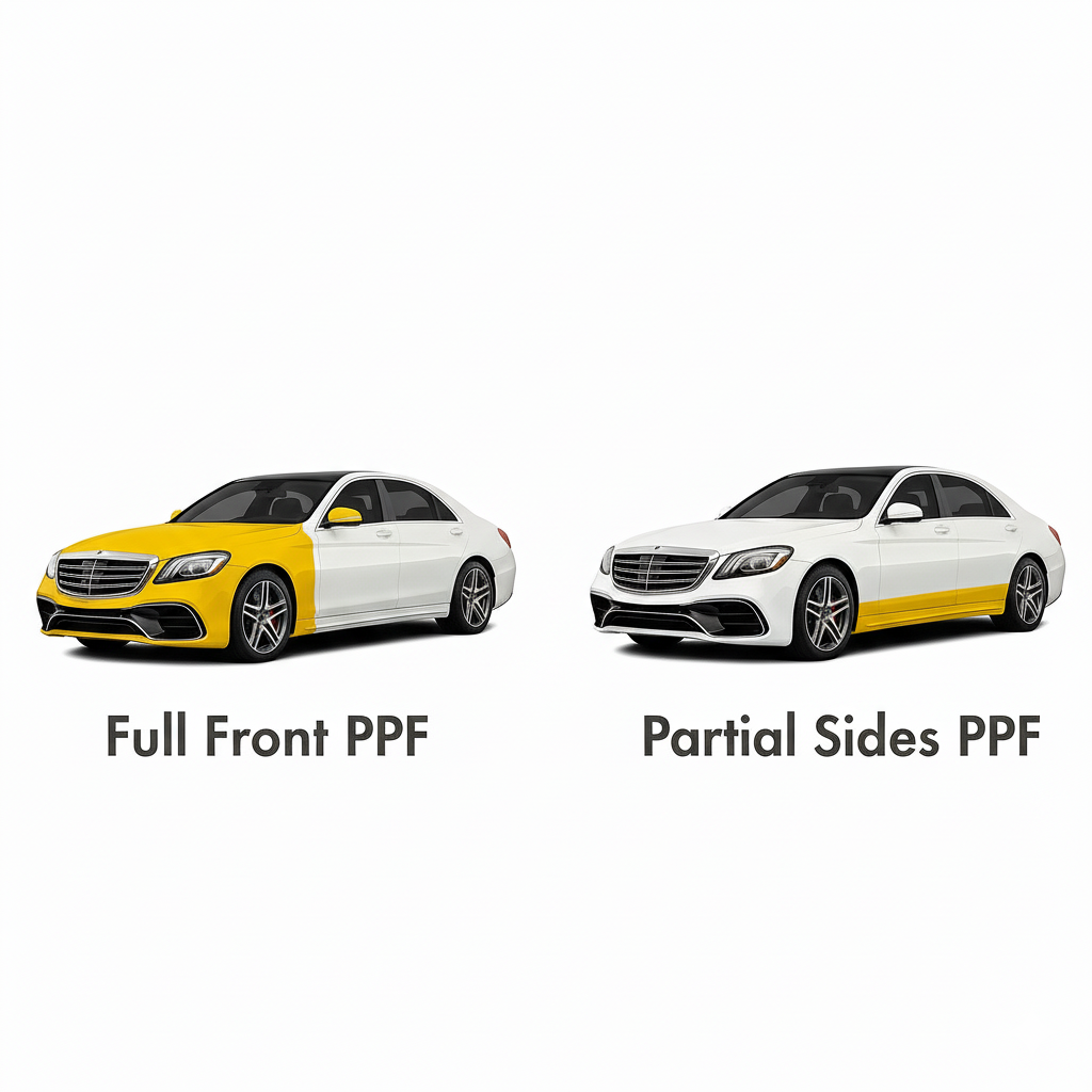 • Coverage: Full front (bumper, hood, fenders, mirrors) plus partial side panels (doors up to rocker panels) and headlights.